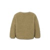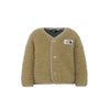 表面にはかさ高があり柔らかな毛足のボアフリース、肌面には滑らかな肌触りのマイクロフリースをボンディングした生地を採用しています。フロントはドットボタンで着脱がしやすく、袖口や裾、襟はすっきりとしたパイピング仕様です。
