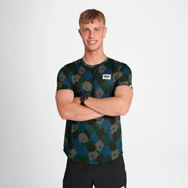 SAYSKYのCOMBATTシャツは、全面にフラワーカモフラージュプリントを施したランニングTシャツです。吸湿速乾性に優れ、ランニング中ずっと高いパフォーマンスを発揮します。特殊な構造により生地が肌に張り付くのを軽減。暖かい気候でのランニング、重ね着、レース当日のウェアとして最適です。