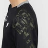 肩口のグラフィックプリントと袖口の配色がデザインアクセントになっています。